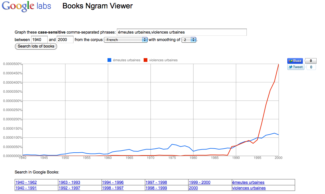 À en croire les millions de pages recensées dans Google Books, les violences urbaines seraient “nées” dans les années 90’. Les émeutes urbaines dateraient elles un peu plus : les premiers soubresauts remontent au XIXe (la Commune se distingue aisément) ; mais c’est surtout après-guerre qu’elles se seraient développées, s’accélérant un peu avec les années 80-90.