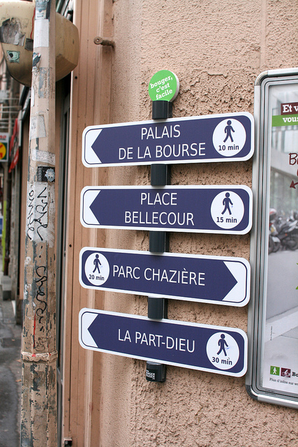 Cet hiver a vu naître, dans nos centres urbains, une nouvelle espèce de panneau signalétique, indiquant le temps de marche nécessaire pour rejoindre quelques destinations relativement proches (de 10 à 30 minutes à pied).