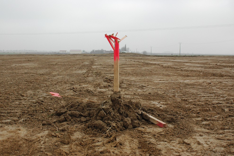 Quand l’équipe d’OWNI s’est rendue sur la plate-forme de Jouarre jeudi 16 février, les bulldozers avaient déserté, laissant en plan un champ boueux d’un hectare entouré de talus sur trois côtés au milieu duquel trônait un piquet de bois et une tige métallique bleue. Garé le long de la route, un employé de la Direction départementale de l’équipement et un groupe de salariés de Toréador nous ont aimablement salué avant de s’en aller. « Le maire de Jouarre était venu sur le chantier demander l’arrêt des opérations, » nous explique-t-on à la mairie. Mais la vraie décision est venue « d’en haut ». « Conformément à la demande de la ministre, les travaux ont été suspendus, nous répond-on en préfecture. Nous ne nous prononçons pas sur le sujet : nous ne faisons que relayer les communiqués du ministère sur la question. »