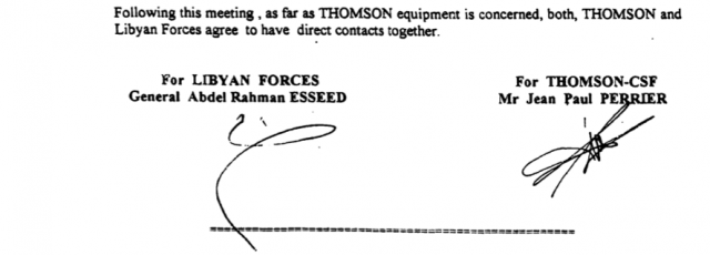 Comme le précise le document ci-dessus, les réunions ont été organisées « avec l’autorisation du gouvernement français », à l’époque dirigé par le socialiste Lionel Jospin, Premier ministre, avec Alain Richard au ministère de la Défense. Et elles se sont déroulées en présence de Jean-Paul Perrier, président de Thales International, la filiale chargée des exportations. Ainsi que du général Abdel Rahman Esseed. Cet officier supérieur de l’armée libyenne dirigeait alors le département chargé des acquisitions ; avec pour principale préoccupation d’obtenir des pièces détachées de nature à maintenir à niveau les différents régiments, malgré l’embargo qui frappait la Libye.