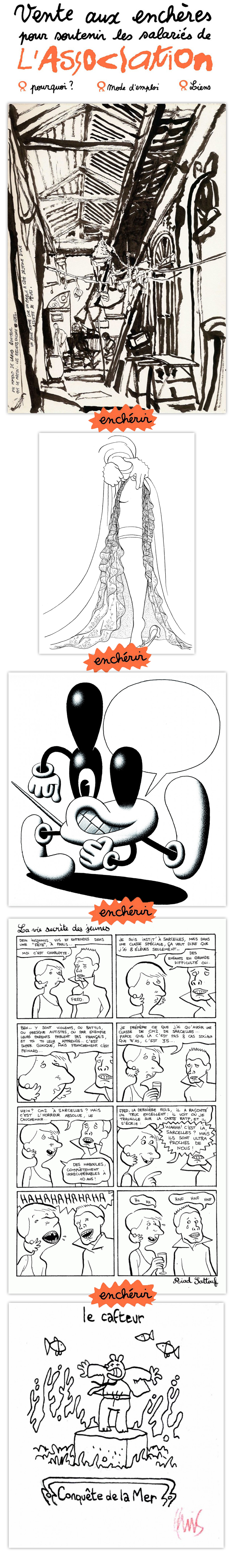 En quelques mots, l’Association va devoir licencier 3 ou 4 salariés (sur les 7 existants). Les salariés sont ainsi en grève depuis un mois car la direction refuse de présenter les résultats et notamment les bénéfices de l’entreprise pour justifier un tel licenciement…). Bref, en soutien aux salariés, les dessinateurs de l’Association ont mis aux enchères, chaque jour, un dessin pour payer les honoraires des avocats et si possible, les aider financièrement à supporter les 31 jours de grève qu’ils viennent de traverser.