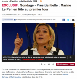 Le fameux sondage Harris Interactive publié dans le “Parisien Dimanche” attribuant à Marine Le Pen la première place d’un premier tour d’élection présidentielle, auquel personne n’a pu échapper, suggère trois séries d’observations.