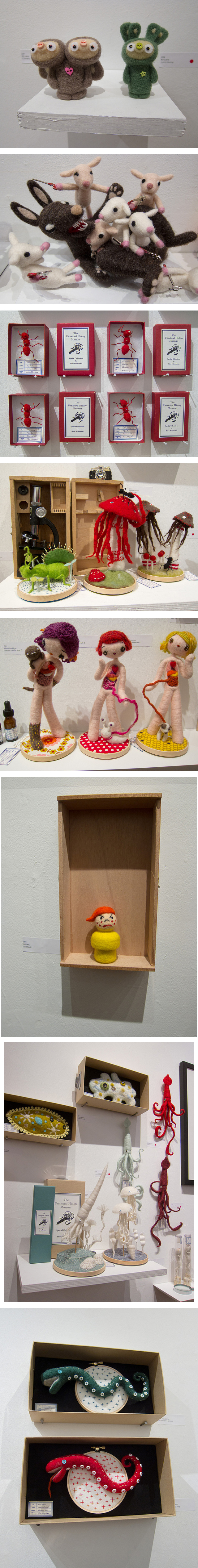 Si vous les aviez raté, voici le mal corrigé, je vous propose quelques photos de la dernière exposition “Needle Felting Extravaganza” à la Galerie Hanahou à New York. Les réalisations de plusieurs artistes (principalement des femmes!) comme les talentueuses Kit Lane, Moxie, Yoko Nomura et Hine Mizushima, sont étonnantes et généreuses, l’ambiance est mignone, cruelle, artistico-scientifique et surtout très colorée. Une tendance à suivre de près, ce n’est pas la première fois que les réalisations en feutre se font remarquer… ;-)