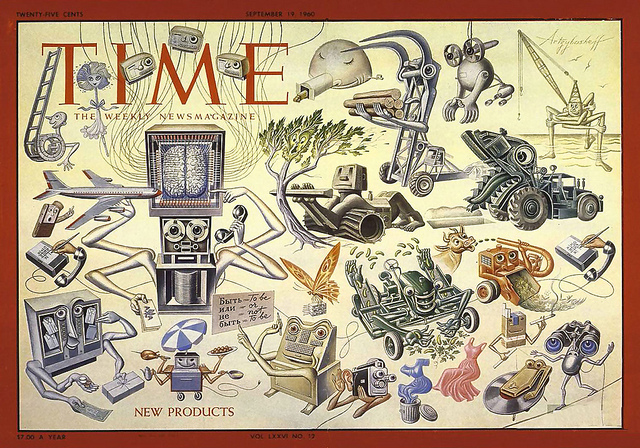 Crédits photo via Flickr: Ray Kurzweil par JDLasica [cc-by-nc-sa] ; Photos par X-Ray Delta One : The wow effect [cc-by-nc-sa] , The mighty hand [cc-by-sa] , Time cover 1965 by Arztybasheff [cc-by-sa], Our friend the Atom [cc-by-nc-sa] , Route du futur [cc-by-sa], Time cover Products & Machines [cc-by-sa]