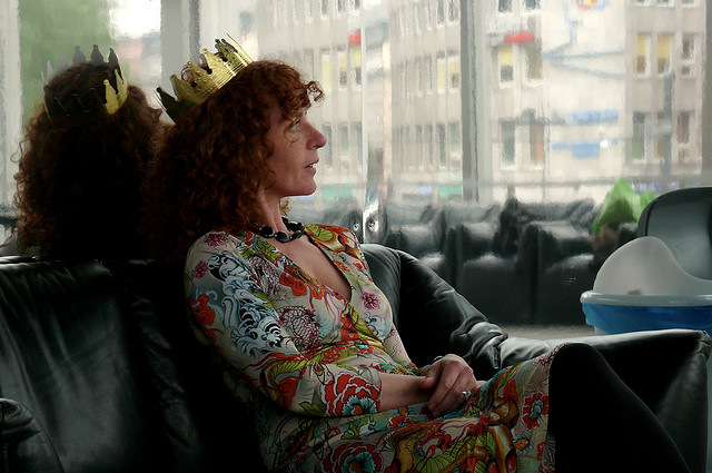 « Chaque être humain porte en lui ses propres objectifs et son travail, et il les abandonne parce qu’il ne peut pas les convertir en argent. » Dans leur film, Daniel Häni et Enno Schmidt insistent sur l’épanouissement personnel que permettrait le revenu de base – un « épanouissement » réel, cette fois, c’est-à-dire débarrassé de sa dimension bullshit qui, aujourd’hui, aggrave l’aliénation en prétendant la soulager, puisque l’on éjecterait de l’équation le couple infernal management-consommation. Ils proposent de « prendre l’individu au sérieux ». Une très belle séquence les montre, à la gare de Bâle, distribuant aux passants de tous âges les couronnes en carton doré dont ils ont fait le symbole de leur combat. « Le plus intéressant dans ce système, c’est que je ne pourrai plus dire à la fin de ma vie que je n’ai pas pu faire ce que je voulais », énonce la comédienne bâloise Bettina Dieterle.