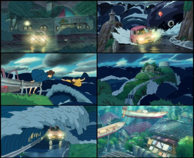 Même Ponyo sur la falaise (2009), de Hayao Miyazaki, qui a les apparences d’un conte pour enfants inspiré de la petite sirène d’Andersen, et qui est souvent présenté comme un des films les plus légers de son auteur, constitue à mon avis une lugubre évocation de l’absence, de la mort, du désastre, et de la violence du rapport de l’homme à la nature. L’héroïne qui donne son titre au film est la cause d’un tsunami qui noie une petite ville côtière. Si le spectateur choisira de croire que les pensionnaires d’une maison de retraite immergée sont sauvés de la noyade par un abri sous-marin plus ou moins magique, il n’est pas interdit de ne voir dans cette intervention qu’une fantaisie consolatrice.
