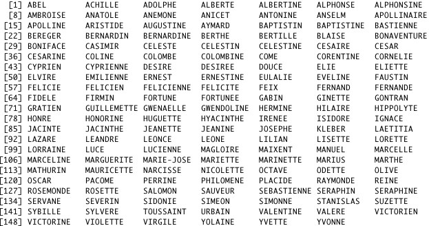 L’on peut commencer par une comparaison un peu anecdotique. Parmi les révisions remarquables, “Baptistine”, pourtant un très joli prénom, disparaît au cours de la deuxième moitié des années 2000. Ce prénom, soit a perdu sa dignité de “français”, soit, et c’est plus probable, n’est plus “couramment usité”. « Adolphe », lui aussi, disparaît. Mais l’on peut aussi être plus systématique. Entre l’ancienne liste et la nouvelle liste, un joli nombre de prénoms qui semblent être “anciens” disparaît.