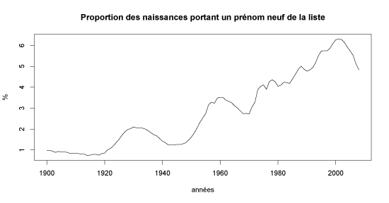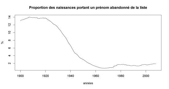 Les nouveaux prénoms : Cathy, Capucine, Alexia, Mathis… sonnent un peu plus “jeunes” à l’oreille d’un Français (la mienne, en l’occurrence). Les deux listes n’étant distantes que de quelques années, il semble bien que le travail de mise à jour soit réel. Si l’on se concentre sur les prénoms abandonnés entre les deux listes, on remarque que ce sont surtout les prénoms les plus anciens qui l’ont été (comme Mariette ou Léandre). Et ceci est confirmé par un traitement statistique rapide. Le graphique ci-dessous montre la proportion des naissances annuelles recevant un des prénoms abandonnés :