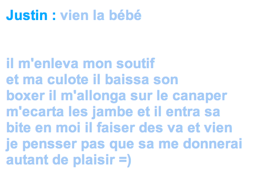 La production avait de quoi surprendre. Imaginez donc. Un long récit pornographique, séparé en deux saisons et quelques dizaines de chapitres. Une orthographe assez douteuse obligeant parfois à lire à voix haute pour saisir l’essence du texte. Une cinquantaine de commentaires sous chaque chapitre. Le succès est au rendez-vous. Mais le plus intriguant est peut-être ailleurs. Le héros de cette histoire est Justin Bieber, star internationale à base de musique pop, et il partage son lit avec sa demie-soeur, Cassy. Ce récit est écrit par une jeune fille qui déclare avoir 16 ans.