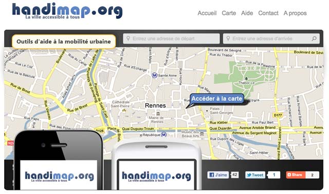 En combinant la donnée “brute”, un vrai travail d’enrichissement et en mixant ces données avec des points d’intérêt spécifique (arrêt de bus accessibles, surfaces podotactiles), ces développeurs ont pu proposer un service de calcul d’itinéraires pour les personnes à mobilité réduite. Leur service, handimap.org est accessible en ligne et sur mobile et figure parmi les lauréats du concours.