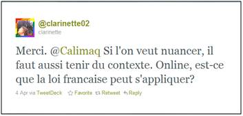 Or dans un commentaire sur Twitter, Clarinette02 soulève de manière fort pertinente la question de la loi applicable, attendu que ces pratiques se déroulent en ligne et impliquent par définition la circulation des contenus, d’une manière parfois difficilement rattachable à un pays donné :