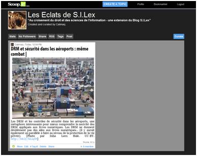 Pour illustrer les choses par l’exemple, je me suis amusé à ouvrir un compte sur Scoop.it (Les Eclats de S.I.Lex) et j’ai essayé de voir comment repropulser un contenu dans le respect du cadre légal. C’est à vrai dire très simple, même si cela demande un peu de travail. Il suffit en plus du titre et du lien, d’accompagner le contenu d’un chapô de son propre cru, et d’aller choisir une image sous licence libre pour l’illustration, en créditant l’auteur et en faisant un lien en retour. Quelques minutes supplémentaires tout au plus, et au-delà du respect du droit, cela oblige à apporter une véritable valeur ajoutée.