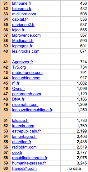 De là , m’est venue l’idée de réaliser un « classement » des sites français, regroupant l’ensemble de ceux-ci. En effet, souvent on ne dispose que de données fragmentaires. Par exemple, le classement de l’OJD [voir Sites d'information régionale : un bilan en demi-teinte] sur les sites de quotidiens régionaux ne contient pas les résultats de l’ensemble des titres. Certains, importants, comme celui de La Dépêche du Midi en sont absents.
