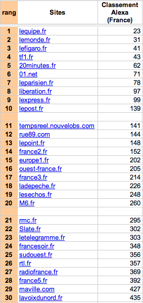 Voici donc le classement des 60 premiers sites d’informations français, classés selon leur ranking en France [l'ensemble des résultats est publié sur ce Google docs]. Cette valeur à l’avantage de placer les sites d’information dans l’environnement réel du web, où se côtoient une multiplicité de types de site: recherche, services, etc. Donc, d’autres sites « non info » s’intercalent entre les sites d’information. J’ai délibérément mêlé les sites produits par les « vieux médias » [télévisions, radios, quotidiens et magazines], avec ceux-ci des pure players, puisque sur le web, il y a une forme d’égalité. L’antériorité de la « marque » peut être un atout, encore faut-il savoir le valoriser. Dernier point, ce classement a été établi un jour précis, le 19 avril 2011 et bien sûr, il sera intéressant de regarder l’évolution de ce classement dans le temps, en particulier de voir l’impact des nouvelles formules sur la fréquentation des sites concernés et de voir si cela améliore leur ranking.