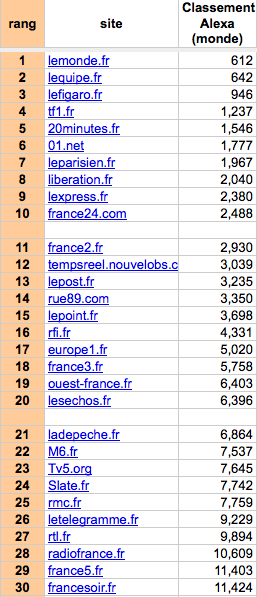 Une précision d’abord. Les sites français dans le classement mondial sont « largués ». Je ne parle même pas de site comme celui de la BBC qui est classé 39e site mondial, par Alexa, ou de celui du New York Times, 84e, mais de sites qui semblent plus proche de notre échelle comme celui du Spiegel. Il pourrait être handicapé, comme nous le sommes, par la langue. Pourtant, il n’en est rien car il est classé 118e. À titre de comparaison, le premier site d’information français, celui du Monde [qui double pour l'occasion L'Équipe], n’est qu’à la 612e place.