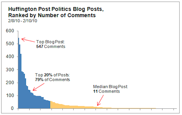 Ensuite, l’apport des blogueurs ne constitue qu’une part minoritaire du trafic et de la conversation amenés sur le Huffington Post, qui tourne aujourd’hui avec une centaine de journalistes, dont une dizaine d’investigation. Nate Silver du New York Times en fait la démonstration [EN] : sur la seule section politique (15% de l’audience du site), les blogueurs apportent autant de contenus que les journalistes, mais génèrent 20 fois moins de commentaires. 80% des commentaires sur les blogs sont d’ailleurs apportés par seulement 20% d’entre eux. La fameuse règle des 80/20.