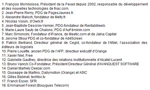 Sur Internet, les commentateurs n’ont évidemment pas attendu le Palais pour se livrer à une inspection en règle du futur comité, dont la liste, comptant -pour le moment- 18 personnalités du réseau français, a déjà été détaillée sur de nombreux sites. Parmi elles, avant tout des “entreprenautes” (comprenez par là des gens qui sont et entrepreneurs, et sur Internet) tel le trio de “business angels” Marc Simoncini (Meetic), Xavier Niel (Free, entre autres) ou Gilles Babinet (le format musical MXP4) , des opérateurs (la brochette SFR, Orange, Bouygues, Free étant a priori présente) et des éditeurs de logiciels (Avanquest, Cegid).
