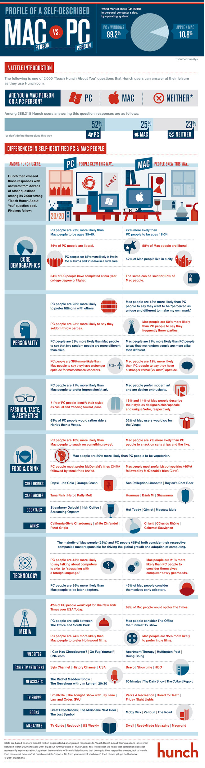 Toujours cette semaine, cette visualisation de données aura été celle qui aura créé le plus d’émoi ces derniers temps car elle aborde un sujet qui touche le cÅ“ur des fanboys (d’Apple ou de Microsoft). C’est donc le site Hunch.com qui nous a présenté ces informations visualisées sur la différence entre les utilisateurs de Mac et de PC !  En quelques mots, l’image nous fait ressortir que les utilisateurs de Mac sont plus susceptibles d’être de jeunes libéraux et de vivre dans les villes. De même, les utilisateurs de Mac sembleraient être de plus grands fêtards que les utilisateurs de PC. Bref, si ces questions vous intéressent, je vous invite également à aller jeter un oeil du côté de ce qu’est un graphiste sur PC, car oui, ça existe ! ;-)
