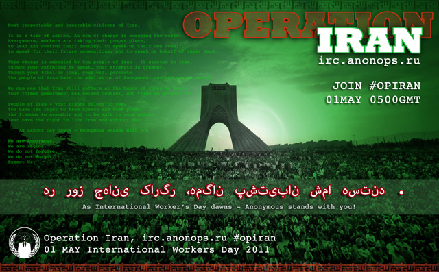 Le 1er mai, les Anonymous lancent une nouvelle attaque contre les sites du gouvernement iranien. Les sites du Guide suprême, du Président et du Parlement sont régulièrement inaccessibles depuis.