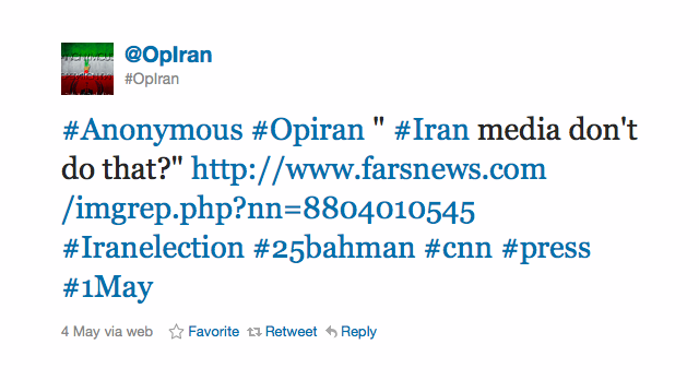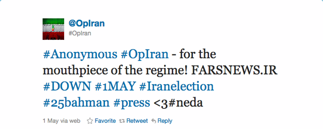 “Nous avons été contactés par des étudiants et des activistes iraniens mi-mars via les réseaux sociaux, a expliqué à OWNI l’un des auteurs de l’opération. C’est eux qui ont choisi la date du 1er mai et ont défini les sites à attaquer”. Un compte Twitter recense les succès et se félicite d’atteindre la plupart des objectifs. Quatre minutes après le lancement de l’opération, les Anonymous annoncent avoir rendu le site de l’agence de presse semi-officielle Fars News inaccessible :