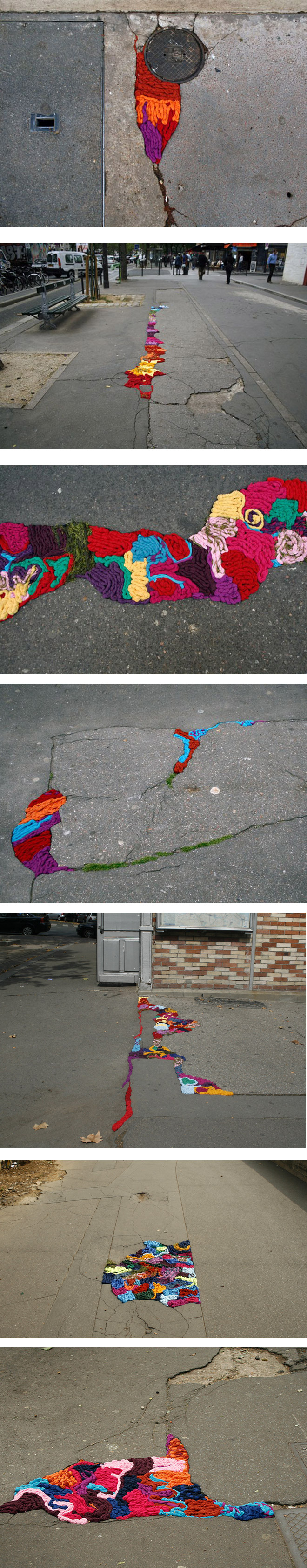 Vous l’avez sûrement vue cette semaine, cette série de photographies présente les tricots de laine de l’artiste Juliana Santacruz Herrera qui a décidé d’injecter de l’imaginaire et de la couleur sur les trottoirs parisiens en bouchant les fissures et autres trous de la rue. Cette intervention visuelle est simple colorée et joue sur le contraste entre la couleur de la laine et le gris urbain. Le résultat est graphique, simple et surprenant.