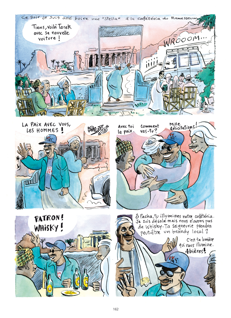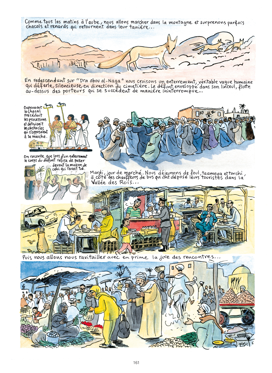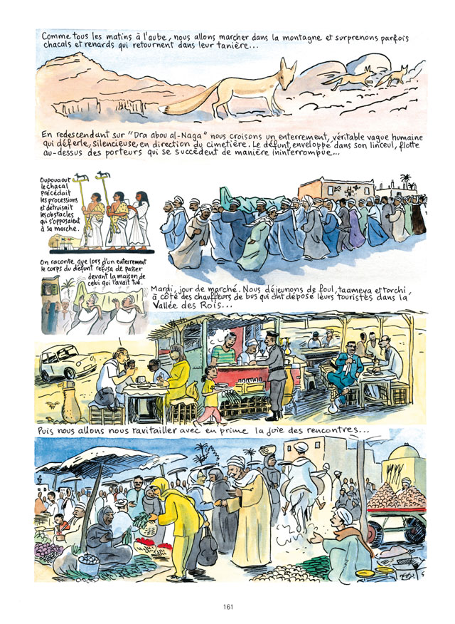 “Chroniques de la nécropole” est une BD à part. De celle qui raconte à la fois un destin personnel et celui d’un peuple. L’histoire perso est celle de Golo et Dibou, un couple de Français qui s’est installé au bord du Nil, tout près de Louxor et de son trésor archéologique. Deux artistes (lui dessine, elle coud) qui tombent amoureux d’une terre et de ses habitants, pauvres paysans égyptiens.