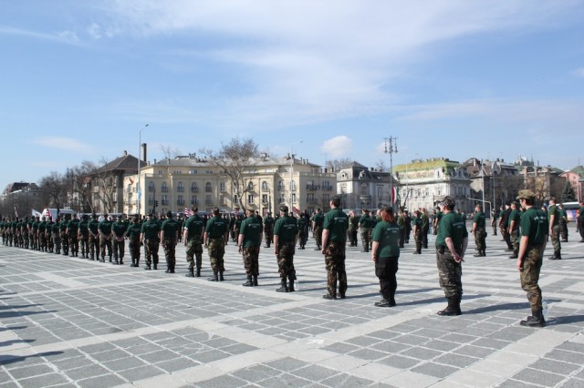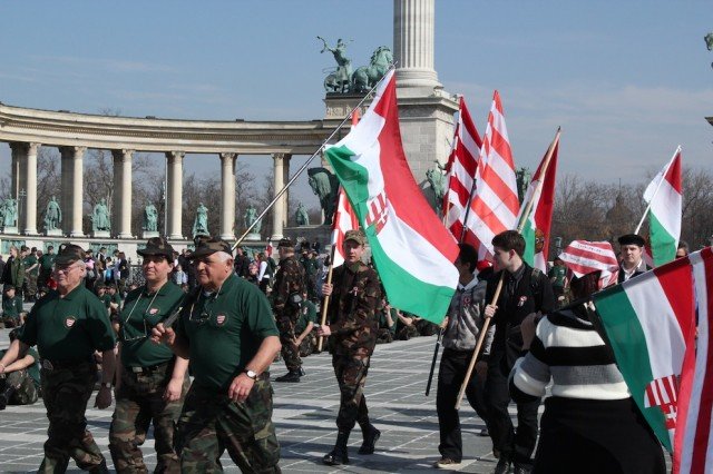 Effectivement, lorsque je me rends à Deák Ter, vaste place au cœur de Budapest où sont rassemblés quelques 3000 militants Jobbik pour commémorer la fête nationale, je comprends que le round d’observation est achevé… « Jobbik pense qu’il est temps de faire revenir la Magyar Gárda sur scène », m’avait confié Krisztián Szabados. C’est littéralement ce qui se passe sous mes yeux. Je suis à une cinquantaine de mètres de l’estrade, dans une foule enthousiaste au-dessus de laquelle flottent des dizaines de drapeaux Jobbik et Árpád. Au premier rang, des gardistes en uniforme s’apprêtent à acclamer le premier orateur prévu au programme : leur chef, Juhász Tamás, capitaine de la Magyar Gárda Mozgalom (« mouvement de la garde nationale », la Gárda canal historique en quelque sorte).