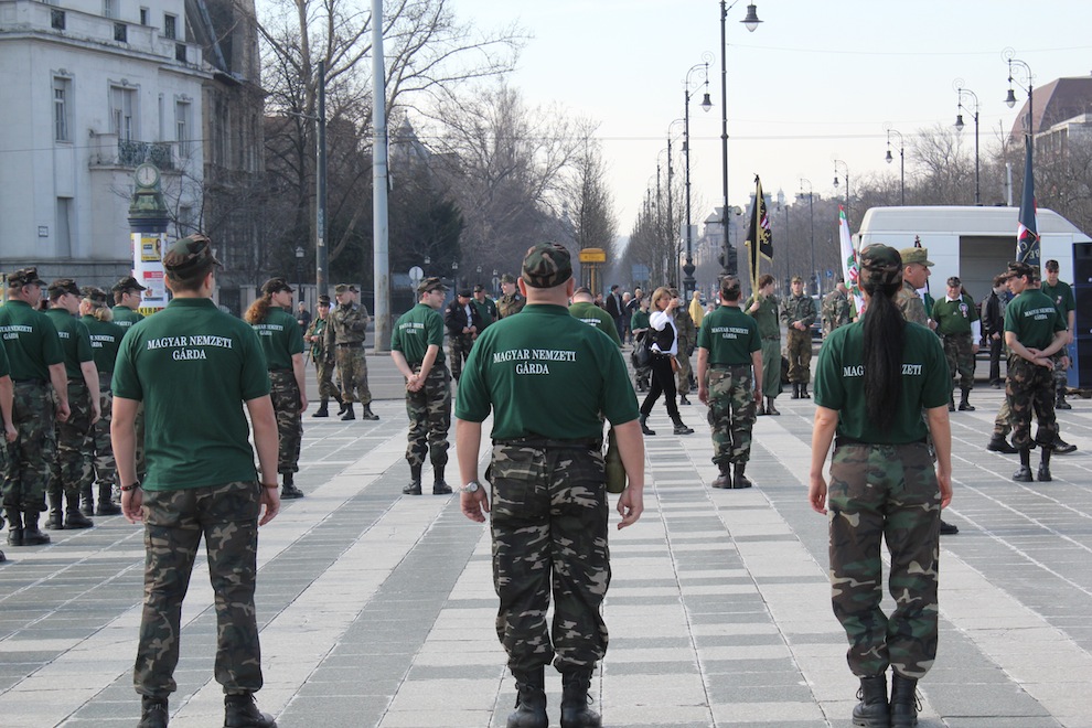 Budapest, 15 mars 2011, jour de la fête nationale hongroise. Un touriste anglais me demande qui sont ces centaines de crânes rasés qui s’installent tranquillement sur la place des Héros, à quelques mètres du musée des Beaux-Arts. Sous un soleil éclatant et dans une atmosphère bon enfant, la garde nationale hongroise, une milice liée au parti d’extrême droite Jobbik, prend possession des lieux pour commémorer la date anniversaire de la révolution de 1848. Venues des quatre coins de Hongrie, les garnisons de «gardistas», ainsi qu’on les appelle ici, débarquent progressivement et quadrillent l’endroit en longues rangées, sous l’œil bienveillant de quelques dizaines de sympathisants.