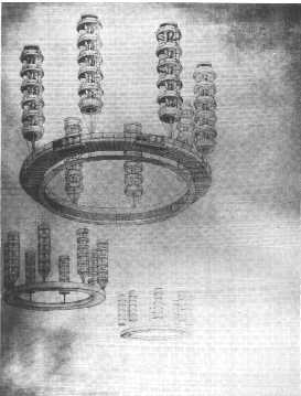 Le quartier industriel, ancré dans le sol, se développe à l’horizontale ; la partie habitat, suspendue dans les airs au-dessus des secteurs de production, est formée de corps d’habitation de cinq étages ancrés dans un anneau central [...] ; le troisième élément structurant est un principe de voies de communication aériennes. En réalité la ville ne vole pas (c’est le rendu perspective en contre-plongée qui donne une impression de ville aérienne).