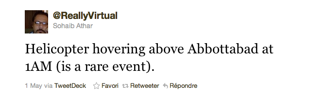 Au moment où les Américains entament leur raid sur le fief du leader d’Al Qaida, il se trouve un individu, Sohaib Athar, consultant, pour envoyer des messages sur Twitter via son téléphone portable. Il se trouve qu’il habite à côté… Il ne se rendra compte qu’après qu’il a en fait “couvert” en direct la mort d’Oussama. Symbole très fort de la puissance du mobile et de Twitter, et de comment l’explosion de l’usage des deux va continuer de bouleverser la couverture et le traitement de l’info. Notez bien : le tweet a été envoyé du fin fond du Pakistan…