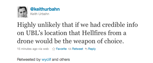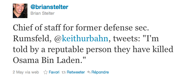 10h24 – Keith Urban, que personne ne connaissait jusqu’ici, annonce sur Twitter la mort d’Oussama Ben Laden, quelques heures après l’intervention des Navy Seals. En fait, Keith Urban est une source fiable : il est le responsable du staff de Donald Rumsfeld, l’ancien secrétaire d’État à la défense.