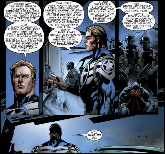 Après une période de remise en cause importante (Civil Wars, série publiée en 2006-2007 pendant laquelle Captain America s'élevait contre la restriction des libertés des super-héros par le gouvernement américain - allusion à peine voilée au Patriot Act), le héros à la bannière étoilée choisit son camp et empêche de nuire un activiste qui s'est attribué son costume (qui est en quelque sorte son double et affirme partager ses valeurs) pour diffuser des informations secrètes qui, bien que vraies, peuvent mettre des vies en danger. On lira ici une réponse à Julian Assange, Bradley Manning et Wikileaks : "vous avez peut-être raison, vous êtes peut-être de bonne foi, mais on ne va pas vous laisser faire pour autant." (Secret Avengers #12.1).