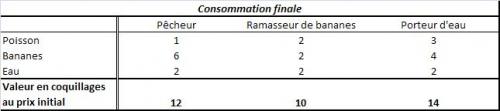 Tout excité, le pêcheur accepte et utilise les deux coquillages supplémentaires pour s’acheter deux bananes pour compenser la perte alimentaire du poisson vendu. Cependant, le porteur d’eau désire toujours ses quatre bananes, tout comme le ramasseur de bananes. Le pêcheur devra donc convaincre l’un deux de diminuer sa consommation. Il réussit à obtenir les deux bananes supplémentaires en doublant le prix à 2 coquillages plutôt qu’un.