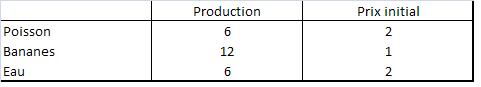 Si vous avez bien suivi l’histoire, vous aurez remarqué que 5 poissons ont été vendus pour 12 coquillages, ce qui fait un prix moyen de 2.40 par poisson, et que 10 bananes ont été vendues pour 12 coquillages, ce qui fait un prix moyen de 1.20. Ces nouveaux prix représentent une augmentation de 20% par rapport aux prix qui prévalaient auparavant.