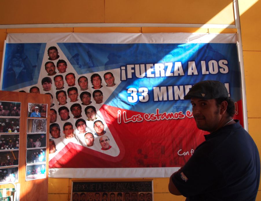 Mario chuchote à l’oreille de sa femme, puis annonce, à haute voix : « Je vais vous confier deux secrets ». Il saisit un livre sur une étagère. Une histoire des 33 parmi tant d’autres, et en couverture, l’image du premier message arrivé à la surface, sur lequel s’est appuyé le Président du Chili Sebastian Pinera, pour annoncer au monde que les 33 mineurs étaient vivants.