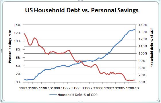 Evolution de la dette des ménages (courbe bleue) et de l'épargne des ménages (courbe rouge)
