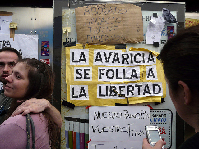 Vous entendez toutes sortes de bêtises sur les mobilisations à Sol1 et dans de nombreuses villes d’Espagne : des théories conspirationistes absurdes [émission de radio] de ceux qui voient des ombres derrière toutes choses, jusqu’à la simplification grossière2 de ceux qui mettent l’étiquette “anti-système” alors même qu’ils ont la réponse sous les yeux. Ou encore la stupidité de de ceux3 qui prétendent être d’accord avec les manifestants [pdf], alors que ceux-ci protestent précisément contre eux, ce qu’ils ont fait et contre ceux qu’ils représentent.