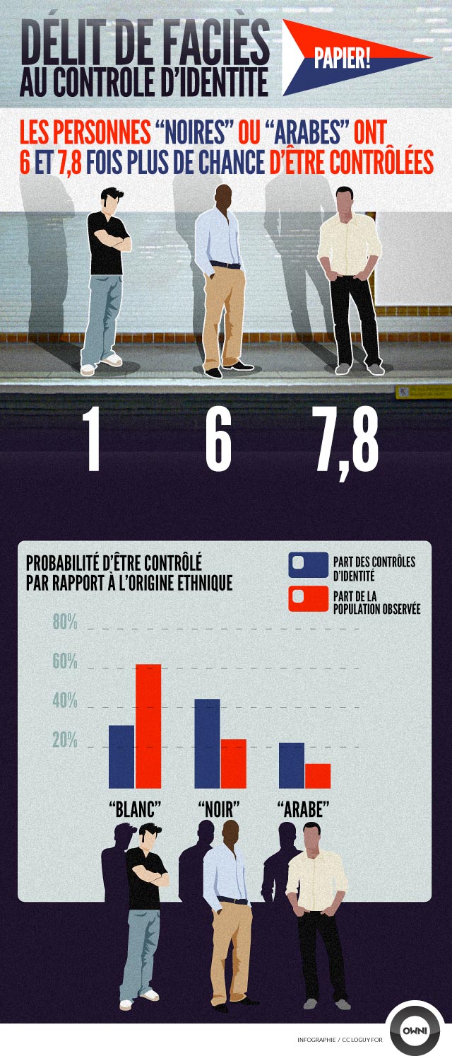 Les avocats sont appuyés dans leur démarche par l’ONG “Open society foundations”, de Georges Soros, milliardaire américain. Le collectif se base en effet sur un rapport publié en 2009 [pdf], intitulé “Polices et minorités visibles : les contrôles d’identité à Paris”. A partir de cette étude, OWNI a réalisé l’infographie suivante :