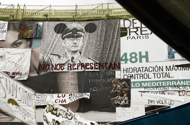 Sol, non comme lieu géographique mais comme événement inattendu, est venu ébranler deux des piliers de l’ordre des choses : d’un côté, il a brisé le consensus établi après la Transition, selon lequel l’actuel système de partis est le meilleur des systèmes de gouvernement et le remettre en question c’est ouvrir les vannes du chaos et de la dictature. Quand la journaliste Àngels Barceló [es] dit « nous ne devons pas céder à la tentation de mettre en cause l’actuel système démocratique », le mouvement insiste : « ce qu’ils appellent démocratie n’en n’est pas une». De l’autre, il rejette l’idée que la crise ne serait qu’un accident météorologique, et que la seule solution face à elle, serait de nous serrer la ceinture. Contre la gestion politique de la crise économique, Sol hurle « C’est du chantage, pas du sauvetage! » et désigne les responsables, politiciens au pouvoir et banquiers.
