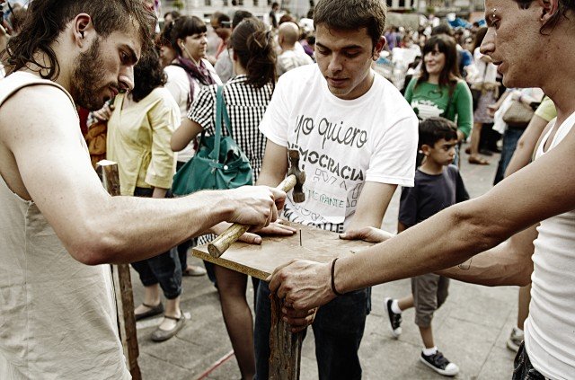 Le 15 mai, débordante de joie par le nombre des manifestants et la fraîcheur de l’atmosphère, une équipe de radio mobile interviewait quelques personnes : « Comment voyez-vous l’avenir ? » Beaucoup de réponses, en dépit de l’énergie ambiante, sont pessimistes : « sombre ». Lundi dernier [23 mai], quand la nouvelle du campement de Sol s’est répandue comme une traînée de poudre dans les réseaux sociaux, un participant d’une liste d’échanges de biens et services a écrit : « A quoi ça sert d’occuper la place, tant qu’il y en a qui continuent de faire leurs courses au Cortes Ingles1 à côté ? » Ca sert, car il ne s’agit pas de n’importe quelle occupation : le geste hardi de certains est devenu un signal pour beaucoup ; c’était « maintenant ou jamais », et la faim d’action a explosé, la faim de paroles.