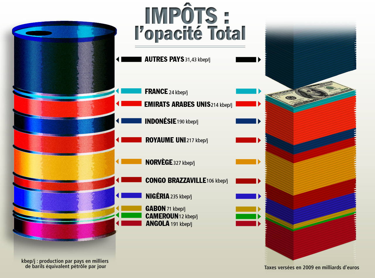 Selon le rapport annuel du groupe, la charge d’impôts de Total en 2009 représente 7,751 milliards d’euros. Mais le document oublie de préciser à combien, à quel pays et à qui sont versés ces contributions fiscales.
