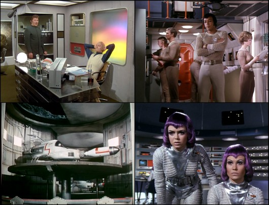 Ce qui frappe, par contre, c’est l’ambiance visuelle de la série. Manifestement inspirés par 2001 : L’Odyssée de l’espace, les producteurs mélangent les véhicules-jouets et les uniformes de Thunderbirds à du design sixties-seventies futuriste où les meubles sont faits de plastique moulé oranges et où les costumes (tous dus à Sylvia Anderson) sont très variés. L’aspect général, tout en la préfigurant, est assez éloignée de la forme plutôt pure de Cosmos 1999. Entre autres détails, on remarque de nombreuses œuvres d’art qui rappellent l’art cinétique ou cybernétique — derrière le bureau de Straker on voit par exemple un tableau animé qui rappelle le Mur lumière ou le Lumino de Nicolas Schöffer.
