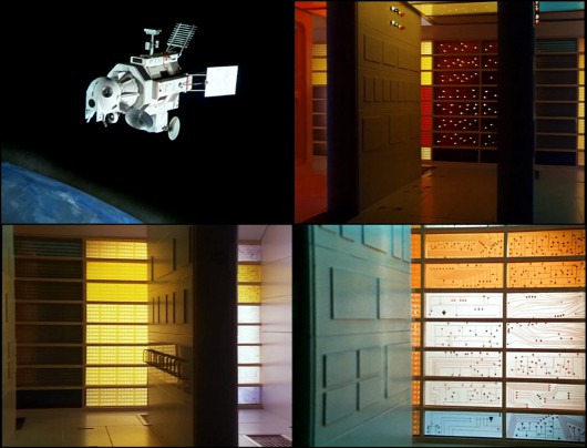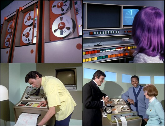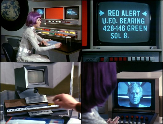Parmi les choses finalement bien vues dans UFO, il y a l’omniprésence des ordinateurs. Il s’agit pour l’essentiel de mini-ordinateurs équipés de lecteurs de bandes magnétiques et de boutons clignotant dans tous les sens, selon une esthétique installée depuis le milieu des années 19503 . On voit aussi de nombreux postes d’observation-radar semblables à ceux du projet Whirlwind de l’armée de l’air américaine. Des écrans affichent des messages en gros caractères, mais servent aussi à montrer des animations abstraites semblables à celles de John Whitney pour Westworld (1973). On les distingue mal mais cette utilisation décorative de l’affichage informatique, qui nous évoque anachroniquement les économiseurs d’écran inventés bien plus tard et qui s’inspire des osciloscopes, est d’une grande nouveauté pour l’époque.