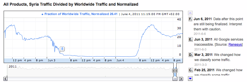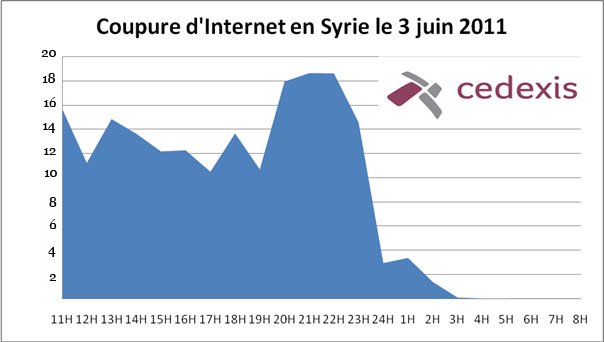 À partir d’une heure dans la nuit de jeudi à vendredi, le trafic chute brutalement en Syrie. “Les téléphones fixes et portables étaient coupés dans presque toutes les villes, mais pas dans le centre de Damas et d’Alep où les forces de police étaient plus nombreuses que les manifestants. Internet était inaccessible partout” détaille Amrou, activiste syrien exilé en France. “Même dans les villes où les portables marchaient, la 3G était inaccessible”. Selon Renesys, une société américaine de conseil en sécurité des réseaux, “deux tiers des réseaux syriens n’étaient plus reliés à Internet” à partir de 6h35 du matin, heure syrienne.
