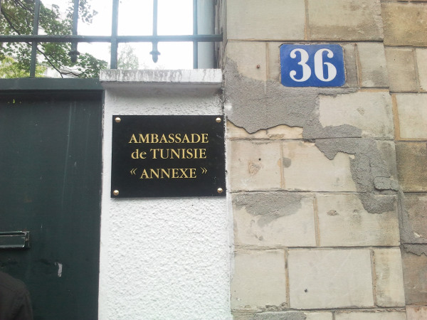 Le 36 Botzaris est non seulement présenté comme un ancien local associatif du RCD, le sulfureux parti du clan de Ben Ali, mais aussi, depuis ce vendredi, comme une annexe de l’ambassade de Tunisie en France. Cette dernière lui a accordé unilatéralement ce statut dans un contexte tendu. En début d’après-midi, des ouvriers sont même venus formaliser cette nouvelle situation en posant une plaque. En lettres d’or, mais entre guillemets, elle affiche désormais un message très clair: