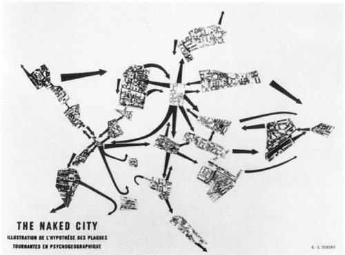 - Enfin, le situationnisme promeut une « pratique habile des moyens de communication ». Et l’un de ses penchants les plus naturels est l’établissement d’une “cartographie rénovée” (voir les collages de cartes que Debord réalise avec Asger Jorn, dont le Guide psychogéographique de Paris, 1957)