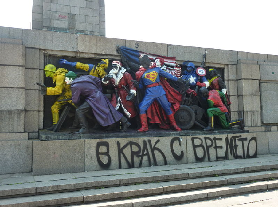 Le street-art a-t-il une éthique ? Les street-artistes doivent-ils s’imposer des limites quant aux lieux qu’ils détournent ? La question est d’actualité : la semaine dernière, les soldats de bronze du monument à l’Armée Soviétique de Sofia (Bulgarie) se sont réveillés barbouillé. Un facétieux – et talentueux – street-artiste a ainsi profité de la nuit pour les repeindre en Superman, Captain America, Joker ou encore Ronald MacDonald et Santa Claus [plus de photos ici]… Pas très subtil sur le plan artistique, mais qu’importe.