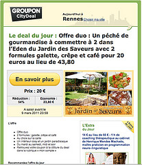 Certains ne se sont d’ailleurs pas trompés, puisque Nice-Matin et La Provence ont déjà dégainé leur propre site d’achat groupés, i-Deals. En Belgique, Groupon a aussi mis un pied, où il compte déjà plus de 700.000 abonnés à sa newsletter et le groupe Rossel vient tout juste de racheter 64% de Groupolitan, qui compte 250.000 abonnés. Et l’on voit fleurir depuis quelque temps des deals sur maville.com. repris dans la version papier d’Ouest-France… La riposte s’organise…