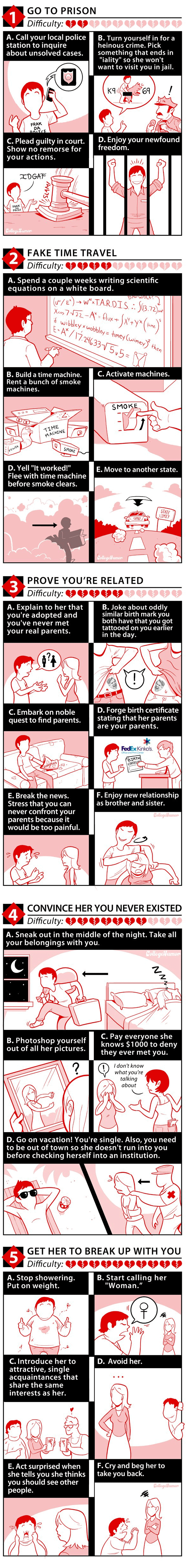 Rompre… Il y a mille et une façons de le faire et jamais ô grand jamais ça ne se passe bien. Cependant, quitte à ce que ça ne se passe pas très bien, le dessinateur Kevin Corrigan  a décidé de rendre ça décalé et amusant en organisant différents scenarii pour rompre avec votre petite amie. Voici donc 5 possibilités très créatives, du passage à la prison au voyage dans le temps jusqu’à faire semblant que vous n’avez jamais existé… ![]()