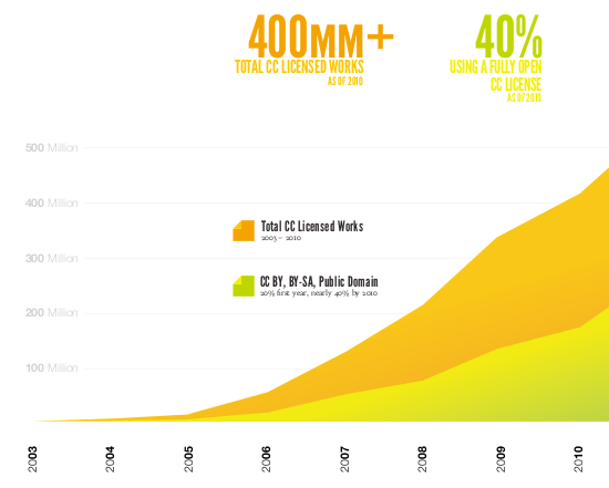 Il me paraît particulièrement important que ce livre soit diffusé en France, où les licences Creative Commons sont encore relativement peu connues, quand elles ne font pas l’objet d’une forme d’ostracisme. En mai dernier, lors de l’eG8 à Paris, le ministre de la Culture Frédéric Mitterrand a explicitement refusé de parler au père des licences Creative Commons, Lawrence Lessig. Mais ces tentatives d’oblitération sont vaines, car l’usage des licences Creative Commons progresse de façon impressionnante, comme le montre le schéma ci-dessous issu du livre : près de 500 millions d’œuvres ont été placées par leurs auteurs sous CC depuis 2003. Même au pays de Beaumarchais (et d’Hadopi…), on ne peut plus passer sous silence un phénomène de cette ampleur.